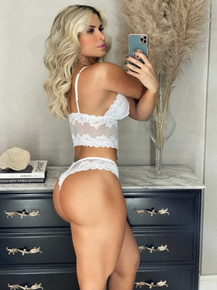 Acompanha as quatro peças: sutiã com aro, saia vazada na parte de trás, calcinha fio com alça regulável e acessório para pescoço e mãos.